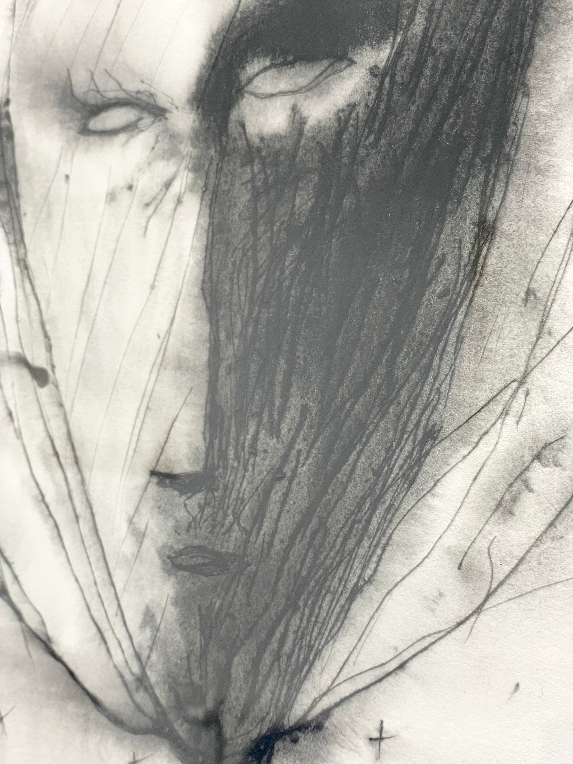 Tracés nerveux, zones d'ombre et lignes de fuite composent un visage à la fois fragile et puissant.